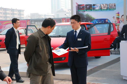 中新網(wǎng)4月19日電在2009(第六屆)全國百強(qiáng)縣市汽車巡展壽光站的現(xiàn)場筆者發(fā)現(xiàn)了這樣的一幕,與其他廠商不同,上海大眾斯柯達(dá)的經(jīng)銷商濰坊天和汽車銷售服務(wù)有限公司的銷售人員,不但在展位為前來咨詢的消費者進(jìn)行講解,而且還走出展位,走到展位外面為消費者講解,吸引消費者來了解更多車輛信息。