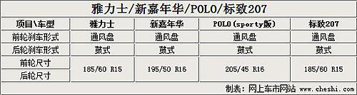 四款車(chē)型的前后剎車(chē)形式都是通風(fēng)盤(pán)+蹄鼓式剎車(chē),輪胎尺寸方面新建年華運(yùn)動(dòng)版和POLO Sporty兩款用到了更大的16寸輪胎并且寬度也更寬,非常符合這兩款車(chē)型突出運(yùn)動(dòng)性的定位。而雅力士和標(biāo)致207的15寸車(chē)輪配合185輪胎寬度在同級(jí)別車(chē)型中也是中規(guī)中矩的配置。