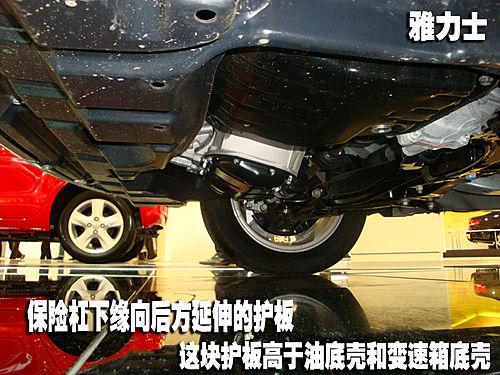 廣豐并未給雅力士提供發(fā)動機下側護板,在其底部我們可以清楚的看到發(fā)動機油底殼和變速箱油底殼這兩項比較容易在“托底”中出現(xiàn)損傷的部件。不過位于前保險杠后方的延長護板更高于發(fā)動機油底殼和變速箱油底殼,因此也能夠起到一定的輔助保護作用。