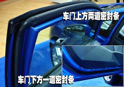 新嘉年華在車門上方提供了兩道密封、車門下方為一道密封,同樣的在車身門框的位置也提供了一圈密封條。不過記者仔細觀察卻發(fā)現(xiàn)新嘉年華的密封條質(zhì)地比較柔軟,并且這臺展車已經(jīng)出現(xiàn)了一些扭曲的現(xiàn)象。