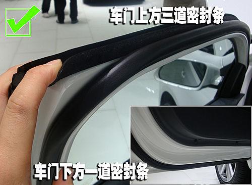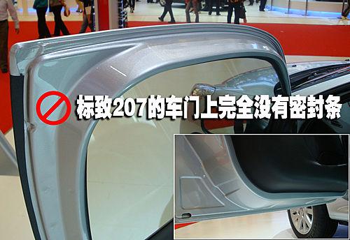 標(biāo)致207在車門一側(cè)完全沒(méi)有設(shè)計(jì)密封條,在其車門上也沒(méi)有任何可以固定密封條的固定點(diǎn)。不過(guò)在車身一側(cè)門框的位置設(shè)計(jì)了兩道密封,不過(guò)盡管是這樣標(biāo)致207依然是這項(xiàng)對(duì)比中最差的一個(gè)。