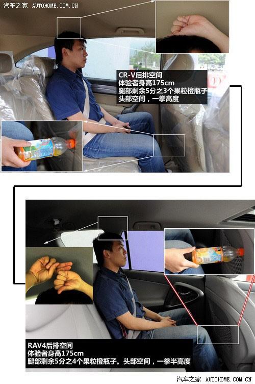 后排空間方面,之前我們看到了RAV4軸距比CR-V長了4厘米,實際體驗中,這4cm在坐進人之后的空間差距還真不小,大家仔細看圖,RAV4剩余了5分之4個瓶子長度空間,而CR-V只剩下5分之3個瓶長,基本上后排腿部CR-V比RAV4短了3-5厘米的距離。(前排位置都是同一人調(diào)整好的)。