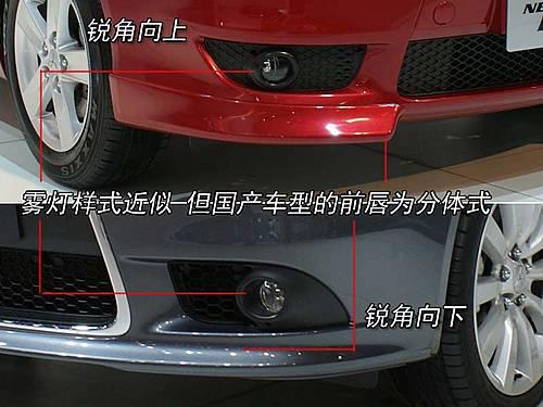 霧燈周邊的設(shè)計(jì)有所不同,塑料的燈罩邊緣的銳角設(shè)計(jì)位置兩車截然相反,但是霧燈的材質(zhì)以及照明方式未變。國產(chǎn)版藍(lán)瑟的前唇為分體樣式,進(jìn)口車為更完整化的一體樣式。