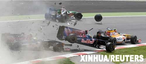 5月10日,紅牛二隊車手布爾代(前中)和隊友布埃米(前左)以及印度力量車隊車手蘇蒂爾(后)、雷諾車隊車手皮蓋駕駛的賽車發(fā)生碰撞。當(dāng)日,F(xiàn)1西班牙大獎賽落幕,布朗GP車隊的英國車手巴頓奪得冠軍。新華社/路透