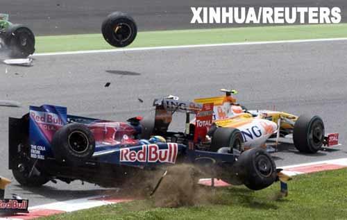 5月10日,紅牛二隊(duì)車(chē)手布爾代(左)駕駛的賽車(chē)在碰撞之后騰空。當(dāng)日,F(xiàn)1西班牙大獎(jiǎng)賽落幕,布朗GP車(chē)隊(duì)的英國(guó)車(chē)手巴頓奪得冠軍。新華社/路透