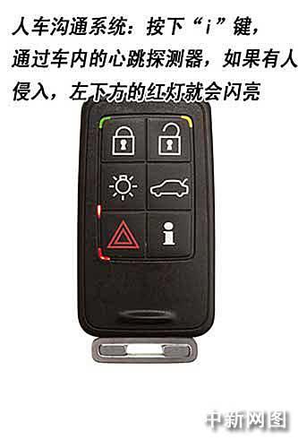 人車(chē)溝通系統(tǒng)(PCC)是沃爾沃汽車(chē)公司所獨(dú)的,將PCC隨身攜帶,在您到達(dá)車(chē)邊時(shí)汽車(chē)將自動(dòng)開(kāi)鎖。按下儀表盤(pán)上的按鈕即可啟動(dòng)發(fā)動(dòng)機(jī)。按下信息按鈕,就可以知道車(chē)門(mén)鎖閉狀態(tài)以及車(chē)內(nèi)的各個(gè)系統(tǒng)是否正常關(guān)閉。一個(gè)很特殊的設(shè)置是,根據(jù)沃爾沃工作人員的演示,按下“i”鍵,就可以通過(guò)安裝在車(chē)內(nèi)的心跳探測(cè)器知道車(chē)內(nèi)是否有人,防止乘客被誤鎖或車(chē)輛被非法侵入的情況。(陳鑫)