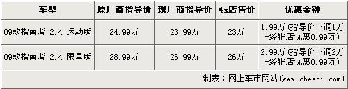 據(jù)經(jīng)銷商銷售人員介紹,09款指南者的官方廠商指導(dǎo)價(jià)下調(diào),運(yùn)動(dòng)版的售價(jià)從24.99萬(wàn)元下降到了23.99萬(wàn)元,限量版的售價(jià)從28.99萬(wàn)元下降到了26.99萬(wàn)元,并且經(jīng)銷商處還有優(yōu)惠,最高優(yōu)惠達(dá)到了2.99萬(wàn)元。09款指南者運(yùn)動(dòng)版與限量版經(jīng)優(yōu)惠后,售價(jià)分別降為了23萬(wàn)元和26萬(wàn)元。銷售人員還介紹,指南者現(xiàn)車店內(nèi)比較緊張,錯(cuò)過(guò)這批現(xiàn)車的消費(fèi)者需交1萬(wàn)元現(xiàn)金,下個(gè)月才可提車。