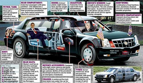 這輛車(chē)其實(shí)是在中型卡車(chē)的基礎(chǔ)上打造而成的。整車(chē)采用了被視為美國(guó)國(guó)家機(jī)密的雙重厚度高密度鋼板、鈦鋼合金和高強(qiáng)度陶瓷,以抵抗各種武器的襲擊,具有防彈功能的車(chē)門(mén)達(dá)8英寸厚,重量相當(dāng)于波音757的艙門(mén)。