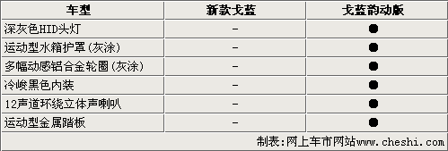 新款戈藍還增加了戈藍韻動版車型,這款新車在整車的設計方面都有新的變化。在外觀方面,戈藍韻動版采用深灰色HID大燈、運動型灰色涂裝水箱護罩以及多幅動感鋁合金輪轂。內(nèi)飾方面采用了黑色內(nèi)飾風格,配備了12聲道環(huán)繞立體聲喇叭和運動型金屬踏板,使整車看上去更具運動氣質(zhì)。