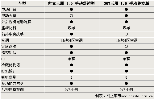 由于兩款車型都是1.6的高配車型,多以在配置方面比較全面。電動(dòng)門窗、外后鏡電動(dòng)調(diào)節(jié)、遙控鑰匙和后排座椅放倒功能都是它們的標(biāo)配。不僅這樣,它們還配備了一些中高級(jí)轎車才配備的冷藏功能手套箱和自動(dòng)雙區(qū)空調(diào)。但是仔細(xì)看下來各兩款車型還是各自都有各自的特點(diǎn),雪鐵龍世嘉三廂配備了定速巡航,可以大大減少駕駛員長途駕駛的疲勞。標(biāo)致307則配備了電動(dòng)天窗。在音響方面,307的8揚(yáng)聲器可以讓乘客更好的體會(huì)到音樂的樂趣。兩款車型都配備了方向盤音響調(diào)節(jié)功能。
