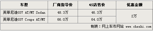 筆者從英菲尼迪北京地區(qū)經(jīng)銷商處了解到,目前英菲尼迪G37銷售的車型包括四門版和兩門版車型,售價(jià)為48.3萬(wàn)和66萬(wàn),F(xiàn)在消費(fèi)者購(gòu)車的話可以優(yōu)惠2萬(wàn)元的現(xiàn)金,優(yōu)惠后售價(jià)為46.3萬(wàn)元。這款車有銀色、黑色、紅色、白色/藍(lán)色等可提供給消費(fèi)者選擇,購(gòu)車的消費(fèi)者可到店具體咨詢。