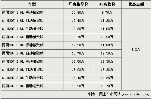 據(jù)東風(fēng)標(biāo)致經(jīng)銷店銷售人員介紹,兩廂標(biāo)致307分為1.6L和2.0L兩種排量,目前優(yōu)惠1.2萬元,入門車型的1.6L 手動(dòng)精致版原廠商指導(dǎo)價(jià)為10.98萬元,經(jīng)優(yōu)惠后僅售9.78萬元,排量稍大的2.0L排量的低配車型手動(dòng)精致版經(jīng)優(yōu)惠后售價(jià)為11.08萬元。現(xiàn)車方面,1.6L車型現(xiàn)車充足,2.0L車型則現(xiàn)車緊張,挑選空間不大。
