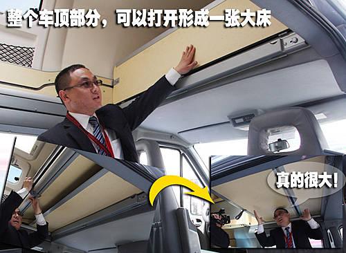 上面圖片中工作人員正在向記者演示隱藏在車(chē)頂?shù)碾p人床,在平時(shí)這張雙人床是隱藏的看不見(jiàn)的。此時(shí)在車(chē)輛中后部都可以擁有非常不錯(cuò)的縱向空間,即便身高在1.8米以上的乘員也不會(huì)感覺(jué)到頭頂?shù)膲阂帧?/p>