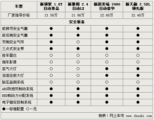 新領馭、新雅閣、新凱美瑞和新天籟作為中級車標桿,其在安全性能方面可謂是下足了功夫。前排安全氣囊、側(cè)安全氣囊及電子穩(wěn)定程序等均成為四款車的標準配置。而新凱美瑞和新天籟配備了自適應氙氣大燈,較其它兩款車提升了夜間行駛安全性。除此之外,新雅閣是四款同級車型中唯一沒有配備側(cè)氣簾的車型,讓人略感遺憾。