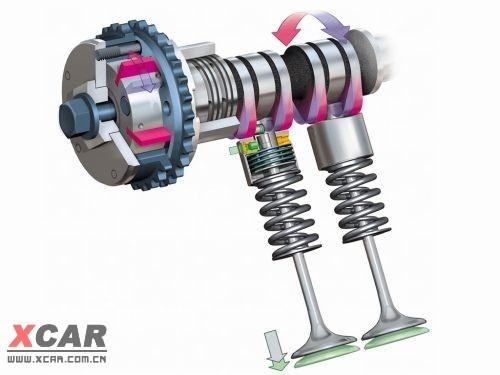 以上所述發(fā)動機可變氣門正時系統(tǒng),是通過微機控制可變氣門調(diào)節(jié)器上升和下降獲得齒形皮帶輪與進氣凸輪(進氣門)的相對位置變化,這種結(jié)構(gòu)屬于凸輪軸配氣相位可變結(jié)構(gòu),一般可調(diào)整20!30。曲軸轉(zhuǎn)角。由于這種機構(gòu)的凸輪軸、凸輪形線及進氣持續(xù)角均不變,雖然高速時可以加大進氣遲閉角,但是氣門疊開角卻減小,這是它的缺點。