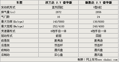 國(guó)產(chǎn)漢蘭達(dá)和新勝達(dá)的排量均為2.7這個(gè)區(qū)間,但是在發(fā)動(dòng)機(jī)形式和技術(shù)上卻存在著本質(zhì)區(qū)別。漢蘭達(dá)的引擎為直列四缸,該發(fā)動(dòng)機(jī)配備了雙VVT-i技術(shù),實(shí)現(xiàn)了卓越的動(dòng)力輸出,同時(shí)進(jìn)一步提高了燃油經(jīng)濟(jì)性。新勝達(dá)則配備的是動(dòng)力輸出更加平穩(wěn)的V型6缸發(fā)動(dòng)機(jī)。兩款車型在動(dòng)力輸出上,漢蘭達(dá)占據(jù)了明顯優(yōu)勢(shì),這一點(diǎn)從動(dòng)力輸出上就可以明顯看出。比較遺憾的是漢蘭達(dá)2.7排量的車型都是前驅(qū),新勝達(dá)則是全時(shí)四驅(qū)。在變速器方面漢蘭達(dá)都配備的6檔手自一體變速器,新途勝則是4速手自一體變速箱。制動(dòng)方面兩款車型都是采用的前通風(fēng)盤(pán)后實(shí)心盤(pán)式的剎車。