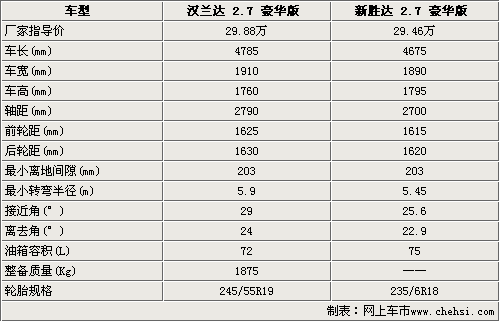 國(guó)產(chǎn)漢蘭達(dá)和現(xiàn)代新勝達(dá)均屬于一個(gè)級(jí)別的城市SUV車型,兩款車型均是2.7排量的高配車型,售價(jià)相差了4200元。在車身尺寸方面,國(guó)產(chǎn)漢蘭達(dá)在車長(zhǎng)、車寬、均超過(guò)了現(xiàn)代新勝達(dá),這一點(diǎn)保證了其內(nèi)部橫向空間及頭部空間的寬敞。在軸距方面,豐田漢蘭達(dá)比新勝達(dá)長(zhǎng)出了90mm,這一點(diǎn)意味著漢蘭達(dá)的腿部空間將會(huì)優(yōu)越于新勝達(dá)。兩款車型的離地空間都達(dá)到了203mm,確保了它們?cè)趶?fù)雜路面上的道路通過(guò)性。越野性能方面,國(guó)產(chǎn)漢蘭達(dá)要優(yōu)越于新勝達(dá),這點(diǎn)從接近角和離去角的數(shù)據(jù)就可以看出來(lái)。豐田漢蘭達(dá)的前后輪距和輪胎橫截面數(shù)據(jù)都要大于新勝達(dá),這表明在操控性能上漢蘭達(dá)將會(huì)略勝一籌。漢蘭達(dá)和新勝達(dá)的油箱均達(dá)到了75升上下,可以為其提供良好的續(xù)航能力。