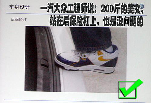 一汽大眾產(chǎn)品部工程師這樣說:“即便一個200斤美女站在我們產(chǎn)品的的后保險杠上,那也是沒有問題的”。雖然我們身邊很少有人去嘗試站在保險杠上,但是這樣的設(shè)計都源自大眾的嚴謹態(tài)度,在很多時候您的愛車完全可以當作一架小梯子去使用。