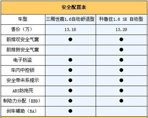 從上面表中我們看出,科魯茲在被動(dòng)安全配備上更出色,除了正面雙氣囊外還配備了側(cè)面安全氣囊,當(dāng)車輛發(fā)生側(cè)面碰撞時(shí)對(duì)駕乘者的保護(hù)要更到位。相比之下三廂世嘉只在更高的豪華型中配備了側(cè)氣囊,不過三廂世嘉的主動(dòng)安全方面卻比較完備,ABS+EBD+BA的組合完全可以應(yīng)付日常緊急情況,而科魯茲相對(duì)來說就有些單薄,甚至在當(dāng)前經(jīng)濟(jì)型轎車都要配備剎車輔助系統(tǒng)的情形下,這項(xiàng)配備的缺失不能不說是一種遺憾!