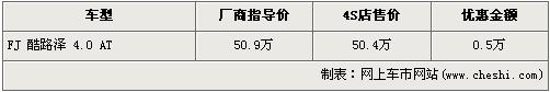據(jù)廣州豐田4S店銷售人員表示,F(xiàn)J酷路澤已經(jīng)停止了進(jìn)口目前在售的都是庫存貨,目前FJ酷路澤有5000元的優(yōu)惠,前段時間的3萬元優(yōu)惠已不復(fù)存在。經(jīng)優(yōu)惠后,F(xiàn)J酷路澤的售價從原廠商指導(dǎo)價50.9萬元下降到了50.4萬元。銷售人員還介紹,目前FJ酷路澤現(xiàn)車不多,多處商家已無現(xiàn)車,其顏色主要以黃色居多,欲購買者應(yīng)快快出手。