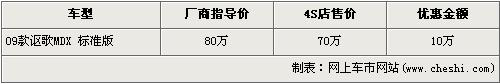 據(jù)經(jīng)銷商銷售人員介紹,09款謳歌-MDX的現(xiàn)金優(yōu)惠10萬元,優(yōu)惠后售價也從原廠商售價80萬降到了70萬。銷售人員還介紹,09款謳歌MDX增加的實(shí)用性的配件包括前下護(hù)板和后下護(hù)板,能避免惡劣路況對底盤帶來的損傷,并且09款謳歌MDX還新增了巴厘海藍(lán)和摩卡褐金兩種顏色,店內(nèi)現(xiàn)車非常充足,顏色也比較全,欲購買者挑選的空間非常大。