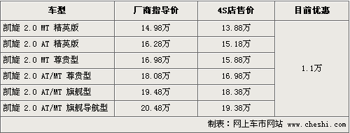 據(jù)4S店銷售人員介紹,目前購買凱旋可以優(yōu)惠1.1萬元,目前現(xiàn)車主要都是自動(dòng)檔車型,主要有黑色、灰色可供選擇,而手動(dòng)精英型和手動(dòng)尊貴型則需要接受預(yù)訂,訂金為1000元,10個(gè)工作日可提車。
