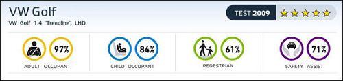 綜合來看,高爾夫6代獲歐洲碰撞測(cè)試實(shí)驗(yàn)室5星評(píng)價(jià)。對(duì)成員保護(hù)得分率97%,對(duì)兒童保護(hù)得分率84%,對(duì)行人保護(hù)得分率61%,安全輔助裝備得分率71%。