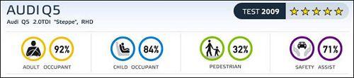 總成績,奧迪Q5在駕駛者保護(hù)上獲得92%較高的得分率,對于兒童的保護(hù)獲得84%的得分率,對于行人保護(hù)相對較低,僅獲得32%的得分率,安全輔助方面獲得71%的加分,最終獲得5星安全評價。