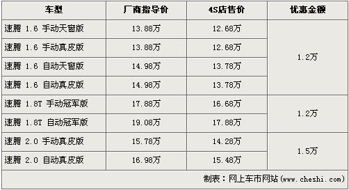 據(jù)經(jīng)銷商銷售人員介紹,速騰1.6L和1.8T冠軍版車型均優(yōu)惠1.2萬元,而2.0L車型優(yōu)惠1.5元達(dá)到了全系的最高。1.6L排量車型經(jīng)優(yōu)惠1.2萬元后,入門級的手動(dòng)天窗版售價(jià)降為了12.68萬元,為全系最低價(jià)。經(jīng)優(yōu)惠后1.8T的手動(dòng)型與自動(dòng)型售價(jià)分別降到了16.68萬元和17.88萬元。高排量的2.0L車型經(jīng)優(yōu)惠1.5萬元,手動(dòng)型和自動(dòng)型售價(jià)分別為14.28萬元及15.48萬元。銷售人員還介紹,店內(nèi)1.6L車型現(xiàn)車較充足,消費(fèi)者挑選的空間大。