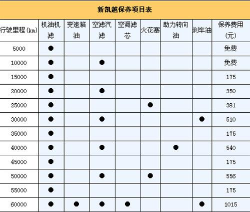 新凱越每次的保養(yǎng)間隔為5000km,首保免費。保修政策為2年/6萬公里保修(以先到為準(zhǔn))。為了方便計算,我們以一年行駛2萬km為標(biāo)準(zhǔn),那么新凱越一年要做四次保養(yǎng)。由下表可知其一年保養(yǎng)費用1400元。