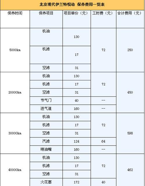 悅動的首保為5000km,以后每次的保養(yǎng)間隔為5000km。保修政策為2年/6萬公里保修(以先到為準(zhǔn))。第二次的10000km保養(yǎng)和首保內(nèi)容相同。那么如果一年行駛2萬km,悅動一年要做四次保養(yǎng)。由下表可知其除了第一年,以后每年的保養(yǎng)費用1500元。