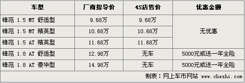 CITY鋒范是本田根據(jù)以中國為代表的全球新興市場的需求而開發(fā)的一款全新車型。鋒范有1.8L 和1.5L兩種發(fā)動機選擇,均采用Honda獨有的i-VTEC技術。自上市以來,鋒范的供貨一直比較緊張,而且沒有出現(xiàn)現(xiàn)金優(yōu)惠。近期根據(jù)網(wǎng)上車市價格監(jiān)測系統(tǒng)顯示,鋒范出現(xiàn)了5000元的現(xiàn)金優(yōu)惠。據(jù)4S店銷售人員介紹,目前鋒范1.8排量車型出現(xiàn)了現(xiàn)金優(yōu)惠,消費者購車可以優(yōu)惠5000元現(xiàn)金,或者直接贈送一年的全車保險,價值也在5000元左右。1.5排量仍然沒有出現(xiàn)優(yōu)惠。