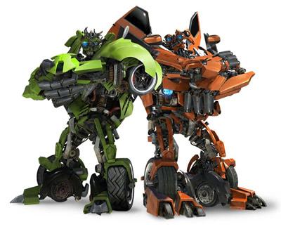 這對在《變形金剛2》中出現(xiàn)的“Twins”,實際上是“剎車”(Skids)和“擋泥板”(Mudflap)組成的二人組。剎車和檔泥板變形之后分別是雪佛蘭的Beat車和Trax概念車,兩個家伙抱在一起還能變成一個大機(jī)器人。為了組合起來比較協(xié)調(diào),他們的膀子都跟得了腦血栓一樣:不一樣長。剎車的右膀子更發(fā)達(dá),檔泥板的左膀子更強(qiáng)勁。