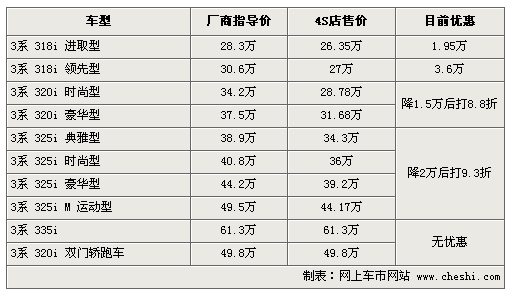據(jù)4S店銷售人員介紹:目前寶馬3系全部大幅降價,最高降幅達到5.8萬元。寶馬318系列目前低配車需要預訂,訂車周期為1個月,高配車型可優(yōu)惠3.6萬,對于一款上市未滿一個月的新車而言,有著較高的性價比。寶馬320系列兩款車型可以降1.5萬后優(yōu)惠8.8折,325系列可優(yōu)惠2萬后打9.3折。寶馬335i和320i雙門轎跑車無任何優(yōu)惠,預定車需等6個月。目前寶馬3系系列下10款車型現(xiàn)車均不多,預訂最短需等10天左右,最長需等半年。