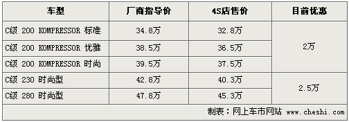 據(jù)4S店銷售人員介紹:目前奔馳C優(yōu)惠幅度較大,全系購車送全險,同時C200K優(yōu)惠達2萬元,C230、C280優(yōu)惠更是達到2.5萬元。不過目前現(xiàn)車較少,有些車型需要預訂,預定周期為1個月左右。C200K優(yōu)雅型與C230時尚型現(xiàn)車較少,C230時尚型甚至將要停產(chǎn),由于這兩款車價格與其它3款車型價格相近,并配置有些令人不滿,所以將要停止生產(chǎn)。