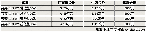 據(jù)銷售人員介紹,奔奔08款目前現(xiàn)車比較齊全,而且優(yōu)惠幅度比前一段時(shí)間也有了提高。原來購買奔奔08款只能贈(zèng)送購置稅,隨著銷售壓力及市場競爭的不斷提高,目前奔奔08款最高可以優(yōu)惠五千元。
