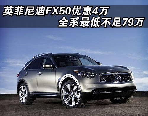 據(jù)英菲尼迪4s店銷售人員介紹,目前店內(nèi)銷售的FX系列有FX50和09款FX35兩款車型。英菲尼迪FX50近期出現(xiàn)了首次優(yōu)惠,降幅為4萬元,經(jīng)優(yōu)惠后售價(jià)從119.5萬元降到了115.5萬元。并且09新款的FX35超越版車型有2萬元優(yōu)惠,售價(jià)也降到了78.8萬元。