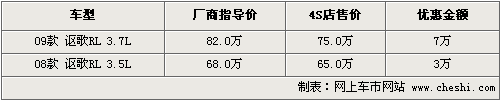 據(jù)4S店銷售人員介紹,目前老款的謳歌RL還有部分車型在售,原來廠商指導(dǎo)價格為68萬元,現(xiàn)在優(yōu)惠現(xiàn)金3萬元,而09款RL現(xiàn)金直降達(dá)到了7萬元,優(yōu)惠后售價為75萬。現(xiàn)車方面有黑色、炭灰色外觀,其他顏色還需要進(jìn)一步預(yù)訂。
