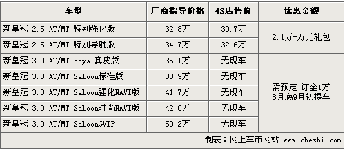 筆者從一汽豐田經(jīng)銷商處了解到,目前新皇冠的價格出現(xiàn)了較大的降幅,最高優(yōu)惠達(dá)到2.1萬元,同時在7月31日之前購車的客戶贈送萬元的禮包,包括了三種不同的禮包。目前皇冠2.5L兩款車型有黑色、白色現(xiàn)車供應(yīng),而3.0排量基本沒有現(xiàn)車,據(jù)銷售人員介紹,目前主要以2.5L銷售為主。如果訂車的話,需訂金1萬元,8月底9月初能夠提到現(xiàn)車。