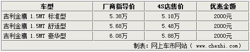 據北京地區(qū)吉利4S店銷售人員表示,吉利金鷹目前只有1.5手動標準型有現車銷售,自動版車型則沒有現車,暫不接受預訂,現在購買吉利金鷹手動版車型,全系都可以優(yōu)惠3000元,在享受國家政策優(yōu)惠的基礎上更加具有吸引力。而全新的替代車型將屬于吉利的全球鷹品牌之下,車型代號為GC515,有望在明年年初推出。