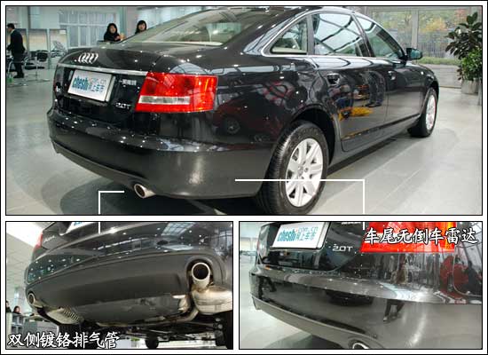 A6L尾部上方由圓潤的流線型改為略微翹起的棱角,具有擾流板的功效,同時(shí)也使尾部造型更顯硬朗和運(yùn)動(dòng)化。在車尾部分“公務(wù)版”A6L的特征在于取消了倒車?yán)走_(dá),但整體造型上左右雙出式的鍍鉻排氣管依然很有氣勢(shì)!