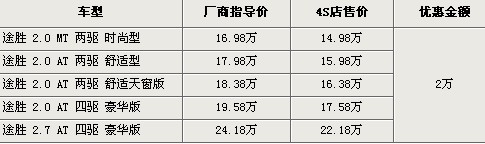 據(jù)4S店銷售人員介紹,目前購買途勝全系可以優(yōu)惠現(xiàn)金2萬元,其中2.0兩驅(qū)時(shí)尚版優(yōu)惠后售價(jià)為14.98萬元。除了現(xiàn)金優(yōu)惠外,此前贈(zèng)送加油卡的活動(dòng)已經(jīng)不再舉行,F(xiàn)車方面,各經(jīng)銷商處現(xiàn)車數(shù)量不多,部分還需要預(yù)訂,定期最快為1周時(shí)間。