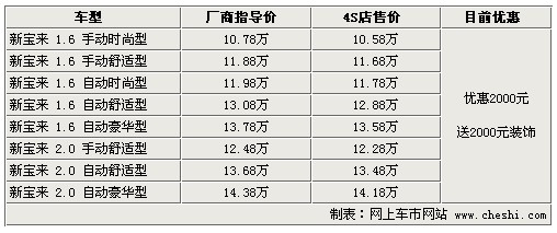 據(jù)4S店銷(xiāo)售人員介紹:目前大眾新寶來(lái)全系無(wú)現(xiàn)車(chē),預(yù)訂需等3周至4周時(shí)間,訂金只需交1000元即可。車(chē)價(jià)方面,新寶來(lái)全系優(yōu)惠2000元,如在店內(nèi)辦理一條龍服務(wù)還可送2000元裝飾;2000元裝飾是消費(fèi)者可以隨意在店內(nèi)選擇,包含地膠、腳墊等,為您提供方便。