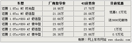 據(jù)4S店銷售人員介紹:目前邁騰最高優(yōu)惠1.2萬元,店內(nèi)購(gòu)車還可送3000元裝飾,裝飾包括地膠、腳墊、汽車防爆膜等。目前邁騰現(xiàn)車充足,1.8Tsi車型銷量較好,所以車源較為豐富,但2.0Tsi豪華型無現(xiàn)車需預(yù)定,預(yù)定需等20天左右。由于2.0Tsi兩款車型銷量較少,所以優(yōu)惠幅度較少,如果您對(duì)動(dòng)力性要求不是非常高的話,1.8Tsi車型可以滿足您的需求,建議購(gòu)買。