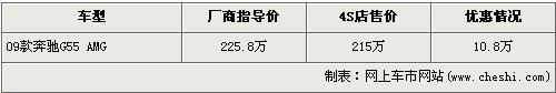 根據(jù)北京奔馳4S店銷售人員介紹,奔馳G55 AMG近期有10.8萬元的優(yōu)惠,經(jīng)優(yōu)惠09款奔馳G55 AMG的售價(jià)從225.8萬元下降到了215萬元,F(xiàn)車方面,店內(nèi)目前還有一輛黑色現(xiàn)車,錯(cuò)過此車的消費(fèi)者需交10萬元訂金,約等半年后才可提車。