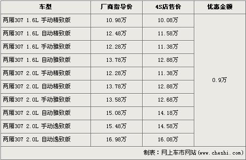 據(jù)東風(fēng)標(biāo)致經(jīng)銷店銷售人員介紹,兩廂標(biāo)致307分為1.6L和2.0L兩種排量,目前全系優(yōu)惠9000元,入門車型的1.6L 手動精致版原廠商指導(dǎo)價為10.98萬元,經(jīng)優(yōu)惠后僅售10.08萬元,排量稍大的2.0L排量的低配車型手動精致版經(jīng)優(yōu)惠后售價為11.38萬元。