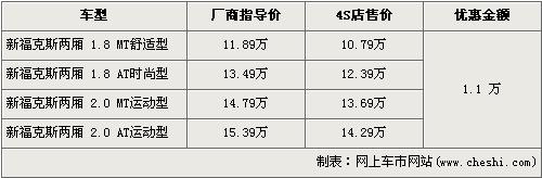 據(jù)長(zhǎng)安福特經(jīng)銷商處銷售人員介紹,目前購(gòu)買(mǎi)兩廂福克斯的消費(fèi)者可以得到1.1萬(wàn)元的優(yōu)惠。兩廂新款?怂狗譃1.8L和2.0L兩種排量,入門(mén)級(jí)車型的1.8L手動(dòng)舒適版經(jīng)優(yōu)惠后售價(jià)下降到了10.79萬(wàn)元。而高配的2.0L自動(dòng)運(yùn)動(dòng)版售價(jià)同樣也降到了14.29萬(wàn)元。