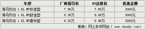 在市場中銷售有段時間的1.6L歡動新車,現(xiàn)已進入各個海馬經(jīng)銷商展廳,現(xiàn)車充足顏色齊全。在售的三款新車均為手動版車型。除直接享受國家1.6L車型的購置稅優(yōu)惠政策外,并有現(xiàn)金3千元優(yōu)惠;銷售人員表示,現(xiàn)金優(yōu)惠也可換為等值的裝飾禮包,同樣超值。現(xiàn)金優(yōu)惠配合購置稅優(yōu)惠,則大大減輕了消費者的購車負擔。