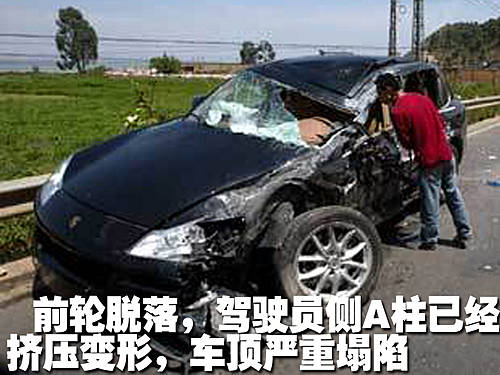 09年5月10日14時左右在高海公路金寶山滇池附近的公路輔路上,發(fā)生了這樣一起令人后怕的恐怖車禍。一臺嶄新的(準確的說,是還沒有上牌的)保時捷卡宴,與一臺拉著水泥運輸大罐車“迎面相撞。
