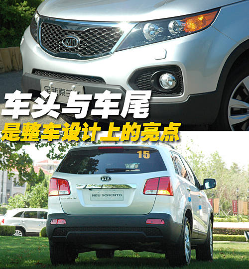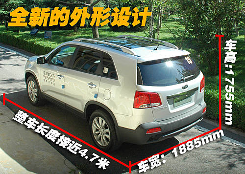 全新索蘭托一改老款車型略顯呆板的外觀造型,全車頭部線條銳利。整車線條非常流暢,車身尺寸為:長4685mm,寬1885 mm,高1755 mm,長度比老款車型增加了95 mm。前部保險杠以及車門多處的鍍鉻裝飾顯得非常有檔次。